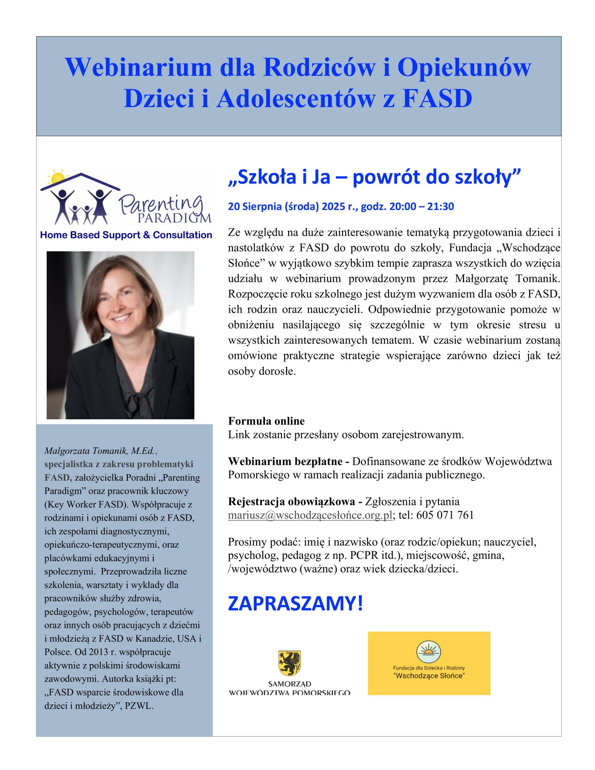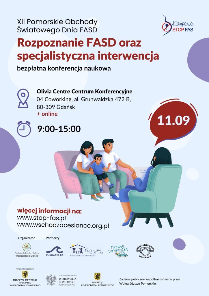 Fundacja dla Dziecka i Rodziny „Wschodzące Słońce” ma zaszczyt zaprosić Państwa na XII Pomorskie Obchody Światowego Dnia FASD. W ramach obchodów tj. dn. 11 września 2025 r. w godz. 9-15 odbędzie się konferencja naukowa „Rozpoznanie FASD oraz specjalistyczna interwencja” w formule stacjonarnej (Olivia Centre O4 Coworking, al. Grunwaldzka 472 B, 80-309 Gdańsk) + online. Następie odbędzie się w formule tylko stacjonarnej warsztat: „Dziecko z FASD bez Tajemnic: Praktyczne Aspekty Opieki i Terapii w Postępowaniu Klinicznym od Rozpoznania do Wsparcia” .
